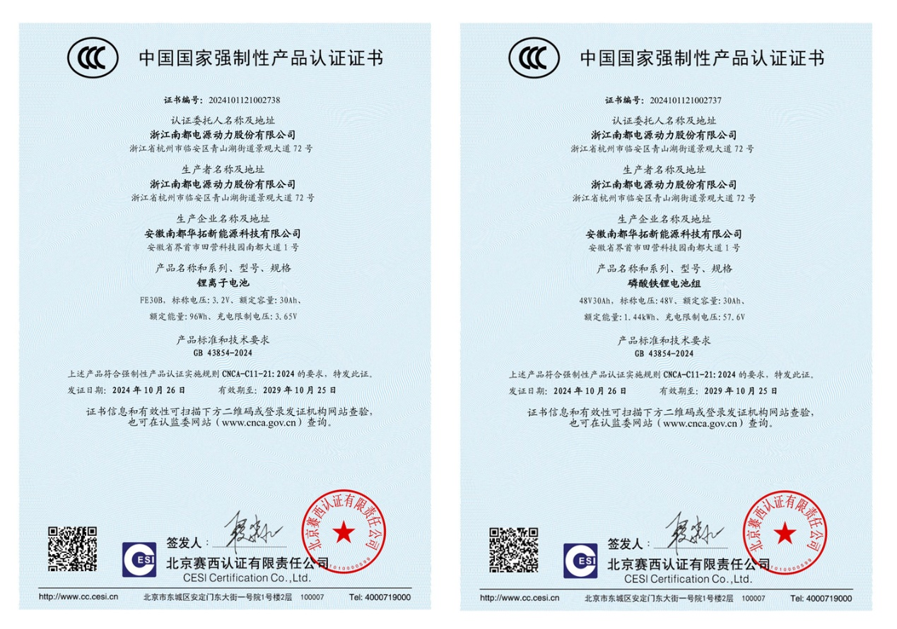 球速体育电源积极响应管理要求,通过提升电池的安全性能、能量密度、循环寿命及环境适应性等关键指标,率先通过GB 43854国家强制标准,同时申请产品CCC认证。
